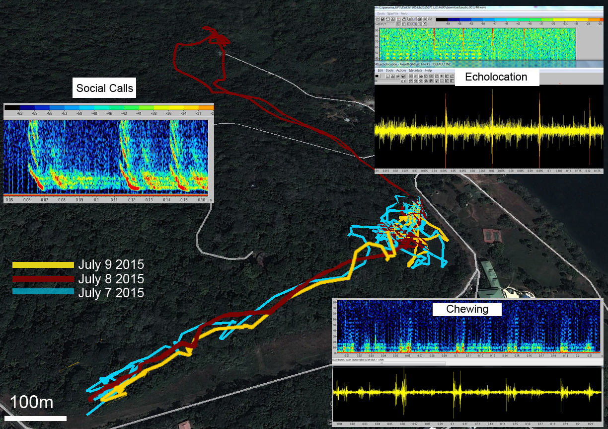 Wow! From just these 3 days, one can already learn so much about the behavior of a wild frog-eating bat. Where did it go? When was it feeding? Where was it communicating with others? The next big step is to conduct field experiments that manipulate their behavior in the wild to tell us about the flexibility of their foraging strategies. We already know this is possible because Rachel’s lab uses playbacks to call the bats into their nets to capture them.