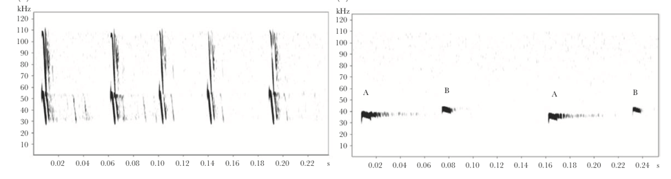 But bats also make other kinds of echolocation calls when searching for prey or commuting to foraging locations (search-phase calls). In some bat species, like Molossus molossus, these two types of calls are actually pretty different in their design (see call images below).