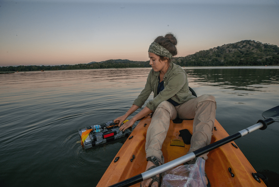 Jenna did her vocal recognition tests under controlled conditions and her new work is taking her to the field using GPS loggers and microphones attached to a different bat species: Noctilio albiventris, which also conveys social information in echolocation calls and also hunts with group members (4,14,15). This bat forages over open water, so to measure prey abundance and bat feeding activity at their foraging sites, Jenna sets up camera traps and ultrasonic speakers from a kayak.