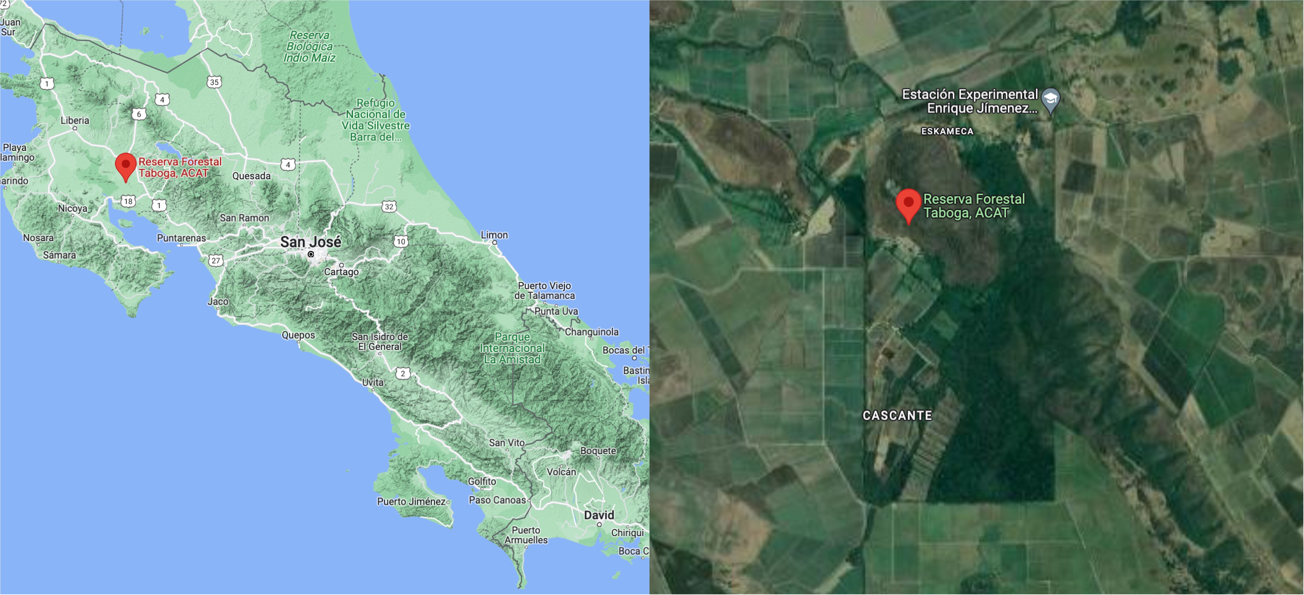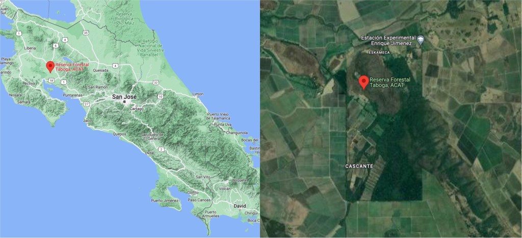 The site we were checking out is the Taboga Forest Reserve in Guanacaste, Costa Rica (below). The reserve consists of 2.97 sq. km. of protected tropical dry forest and sits within an experimental farm that also boasts palm forests, mixed pasture with around ~20 cattle, sugarcane fields, and even tilapia ponds.