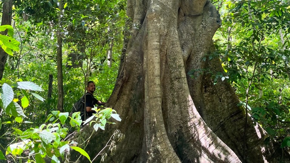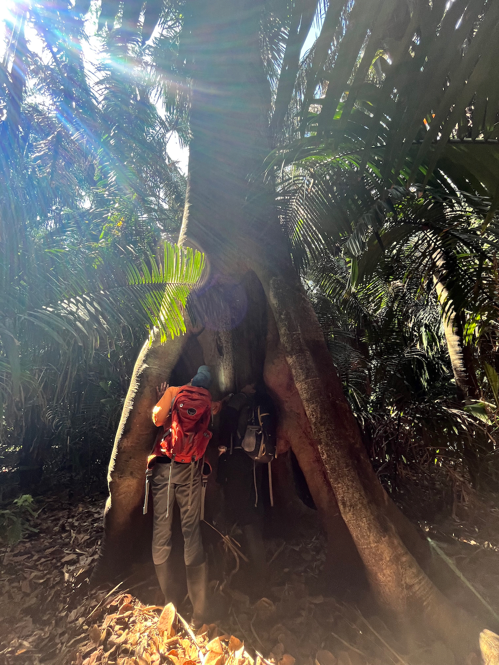 The second strategy paid off immediately: Alex already had some likely trees with hollows in mind. Thanks to him, we found excellent vampire bat tree roosts on the first day (below), as well as many other beautiful trees with other bats inside.