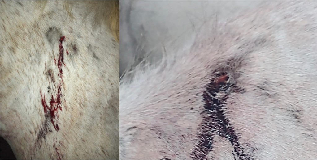 Thore Bergman, Jacinta Beehner, and Marcela Benítez run Capuchins @ Taboga there, a long-term research project studying the cognition and behavior of wild white-faced capuchins. At any given time, there are a dozen researchers living at the field site, spending every day working together to follow one of several well-known groups of monkeys through the forest, identifying them by sight, and meticulously documenting their behavior. We were intrigued by Taboga, because while there are other cattle in the surrounding areas, the immediate vicinity is surrounded by cane fields, and the reserve has the only mature forest in the area. We suspected that the vampire bats might roost in trees in the mature forest and fly to the experimental cattle and horses to feed at night. Before arriving at the site we received promising pictures of the horses and cattle with characteristic bloody bites on their necks (below).