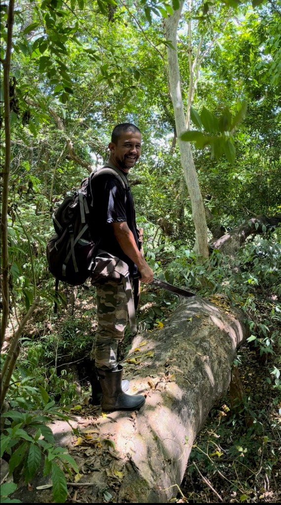 Aside from assessing the general suitability of the site, our main goal for the trip was to find a roost of vampire bats that fed on the experimental cattle. Our first strategy was to place mist nets around the cattle and catch bats as they came to feed, to place radiotrackers on their backs, and then to release them and use radio telemetry to find them in their roosts during the day. Our second strategy was just to walk as much of the forest as possible to try to find bat roosts. We worked with Alex Fuentes (below), a long-time field technician at the station who knows the forest incredibly well.